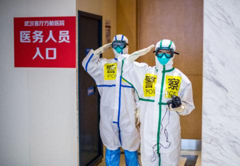 2月25日,在武漢客廳方艙醫(yī)院,來(lái)自武漢市東西湖區(qū)公安分局的民警張錦星(右)與同事劉晨在進(jìn)方艙前向同事敬禮。新華社記者肖藝九攝