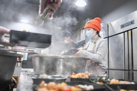 2月26日,“雨衣妹妹”(右)在分裝盒飯。新華社記者程敏攝