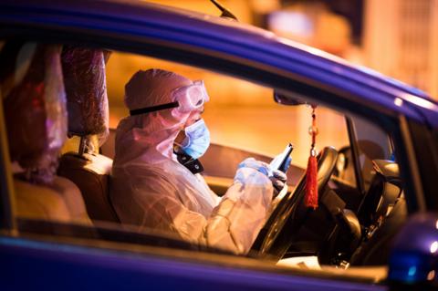 2月29日凌晨,在湖北武漢,志愿者王震在車內(nèi)查看導(dǎo)航。新華社記者肖藝九攝