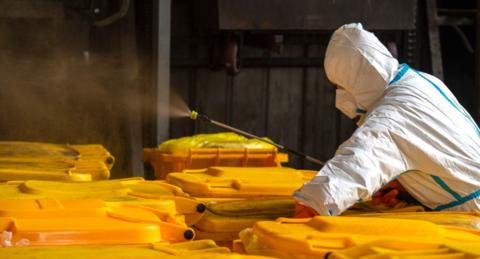 3月4日,在武漢市青山區(qū),工作人員在對(duì)醫(yī)療廢物轉(zhuǎn)運(yùn)箱消毒。新華社記者才揚(yáng)攝