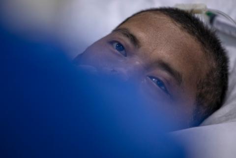 4月5日,在武漢市肺科醫(yī)院,在醫(yī)護(hù)人員撤掉ECMO后,老胡望著醫(yī)治自己的醫(yī)護(hù)人員。新華社記者費(fèi)茂華攝