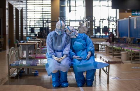 3月10日,在武昌方艙醫(yī)院,兩位青海醫(yī)療隊(duì)隊(duì)員在等待新冠肺炎治愈患者出艙時(shí)小憩。新華社記者費(fèi)茂華攝