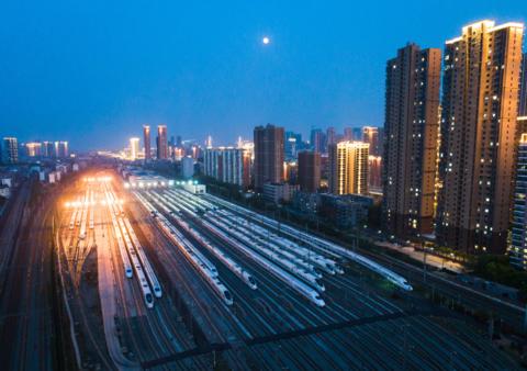 4月7日,在武漢動(dòng)車段,列車??吭诖孳嚲€上。新華社記者肖藝九攝