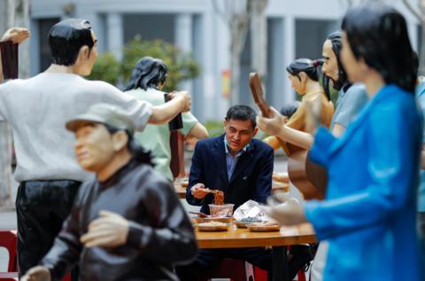 4月5日,市民在武漢市吉慶街的“大排檔”雕塑旁吃熱干面。新華社記者沈伯韓攝