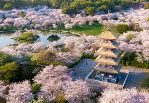 3月20日拍攝的武漢東湖櫻園(無(wú)人機(jī)照片)。新華社記者熊琦攝