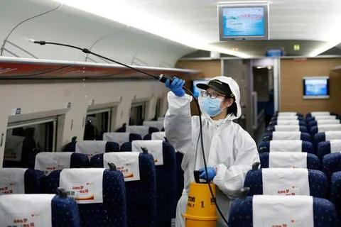 4月7日,武漢動(dòng)車段運(yùn)用車間工作人員周明輝在給列車消毒。新華社記者沈伯韓攝