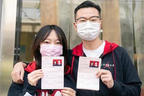 4月7日,在武漢市江岸區(qū)民政局婚姻登記處,陳先生與張女士展示結(jié)婚證。4月3日起,武漢市婚姻登記機(jī)構(gòu)陸續(xù)恢復(fù)辦理婚姻登記業(yè)務(wù)?;橐霎?dāng)事人需持綠色健康碼預(yù)約登記,分批分時(shí)辦理。新華社記者才揚(yáng)攝