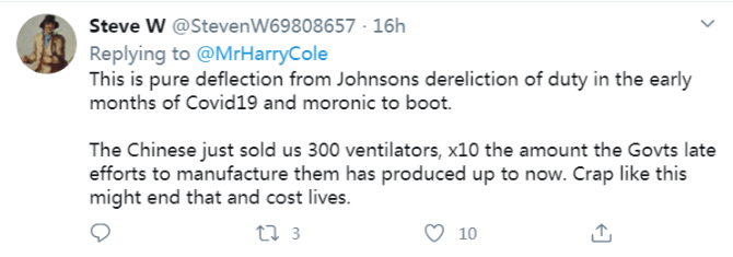 @英國網(wǎng)友:英國政府在轉(zhuǎn)移疫情爆發(fā)初期的失職和反應(yīng)遲鈍。我們剛從中國買了300臺呼吸機(jī),這是政府后來生產(chǎn)數(shù)量的10倍。這樣的廢話需要停止了,這會令生命付出代價的。