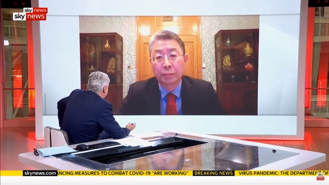 △4月6日,中國駐英國使館馬輝公使在接受英國天空新聞臺“新聞時間”節(jié)目直播連線采訪