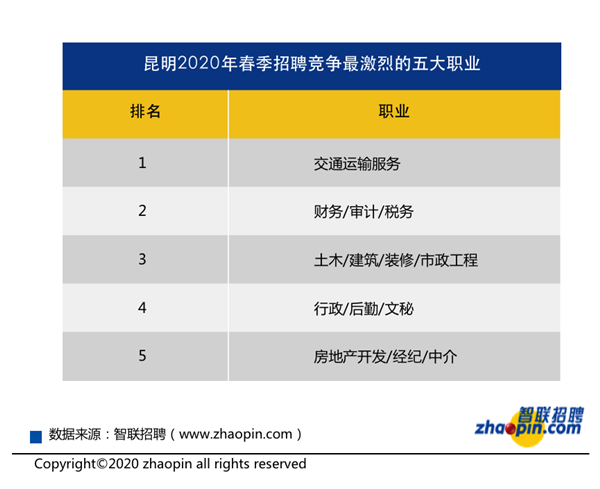 智聯(lián)招聘在線數(shù)據(jù)顯示,昆明地區(qū)2020年春季競爭最激烈的職業(yè)是交通運(yùn)輸服務(wù)、財(cái)務(wù)/審計(jì)/稅務(wù)和土木/建筑/裝修/市政工程。行政/后勤/文秘和房地產(chǎn)開發(fā)/經(jīng)紀(jì)/中介的競爭也較為激烈。