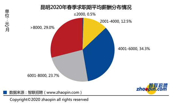 從薪酬的分布情況來看,昆明地區(qū)薪酬水平中等,平均月薪4001元/月至6000元/月的職位占職位總量的34.3%,8000元以上/月的占29.0%,占比較上一季度有所下降。