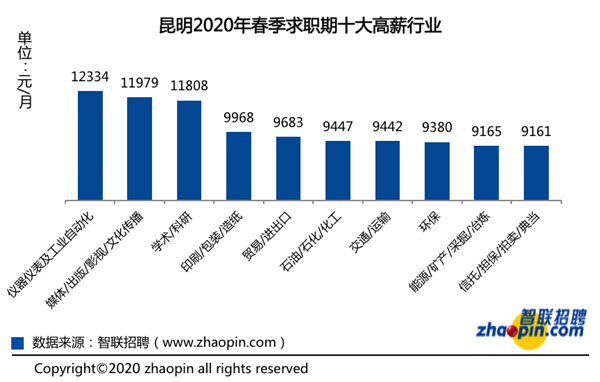 4月8日,智聯(lián)招聘發(fā)布《2020年春季昆明雇主需求與白領(lǐng)人才供給報(bào)告》,全國38個(gè)監(jiān)測城市中,昆明地區(qū)競爭指數(shù)30.4,排名第22位,上升7位。春季平均薪酬為7744元/月,排名第28位,其中,儀器儀表及工業(yè)自動(dòng)化行業(yè)的平均月薪最高,為12334元/月。