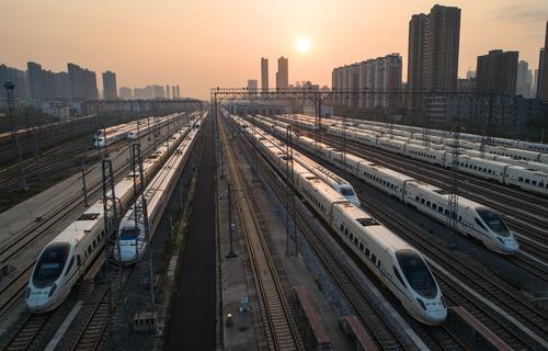 4月8日,在武漢動車段,列車??吭诖孳嚲€上準備投入運行(無人機照片)。新華社記者肖藝九攝