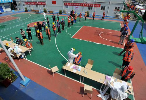 4月7日,在中建八局武漢中央文化區(qū)萬達項目部,返崗員工在接受核酸和抗體指標檢測。 新華社發(fā)(史偉 攝)