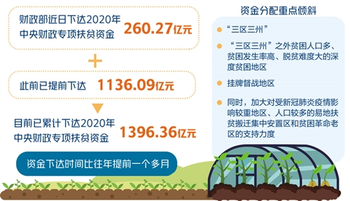 如期高質(zhì)量打贏脫貧攻堅戰(zhàn),資金保障十分重要。近日,財政部下達(dá)各地2020年中央財政專項扶貧資金260.27億元,加上提前下達(dá)的資金,目前已累計下達(dá)2020年中央財政專項扶貧資金1396.36億元,下達(dá)時間比往年提前一個多月。