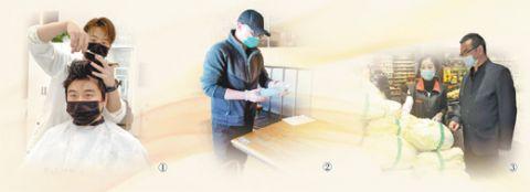 圖①:汪俊義(后)正在為顧客剪頭發(fā)。本報(bào)記者 王 丹攝 圖②:謝益正在門(mén)店內(nèi)進(jìn)行消毒。本報(bào)記者 竇瀚洋攝