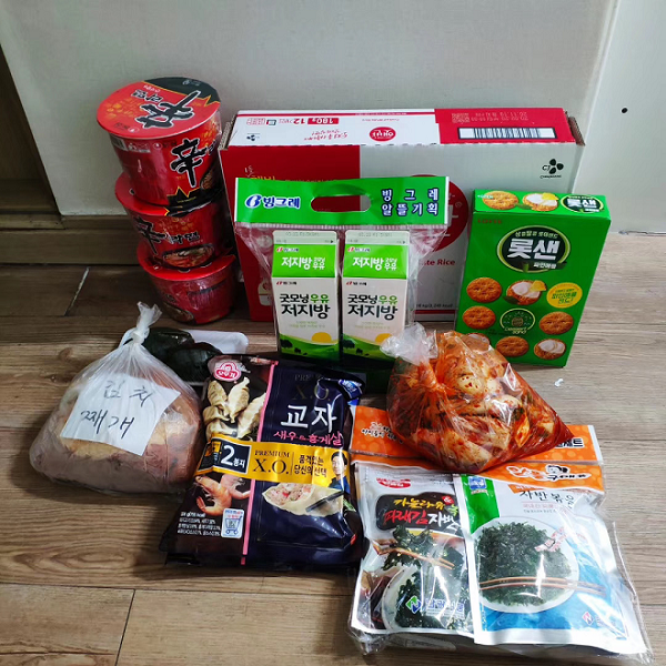房東聽說我到韓國后需要居家隔離14天、不能外出,提前為我準備好了一些食物。16日早上,我收到他的短信說,為我準備的食物放在我的房間門口了,如果還有什么需要的可以隨時聯(lián)系他。我打開門一看,有速食米飯、泡面、泡菜和各種小菜等等。遇到這樣像家人一樣的關(guān)心和幫助我的房東我感到非常幸運,讓我在異鄉(xiāng)隔離期間也感受到了溫暖。