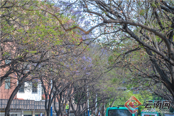 近幾年昆明新晉網(wǎng)紅打卡地教場中路,因道路兩旁的藍花楹吸引了眾多游客的目光。近日,教場中路已有少許藍花楹變換了顏色,藍色的花朵初現(xiàn)。預(yù)計月底,盛開的藍花楹將把這里再次裝點得美輪美奐。