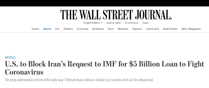 3月26日,美國財政部網站公布了對伊朗15名個人和5家企業(yè)實施制裁的名單。據《華爾街日報》4月7日報道,美國還計劃阻止伊朗向國際貨幣基金組織(IMF)申請50億美元緊急貸款。諷刺的是,蓬佩奧8日表示,“美國愿意提供援助,但伊朗拒絕了”。
