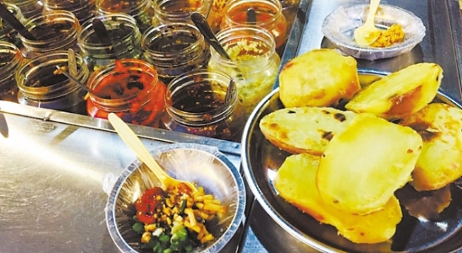 在瀘西街頭,這樣的烤洋芋攤子很多,搭個傘棚,下面一張不銹鋼質感的桌子,桌子一頭的下面放著烤爐,上面堆滿帶皮的洋芋。一頭的上面是裝滿各類醬料的罐罐,客人們圍著醬料而坐,邊流哈喇子邊盯著洋芋的生熟進度。這樣吃洋芋的方式,醬料無限自助,可即興混合,可擇其一種,全憑個人喜好。