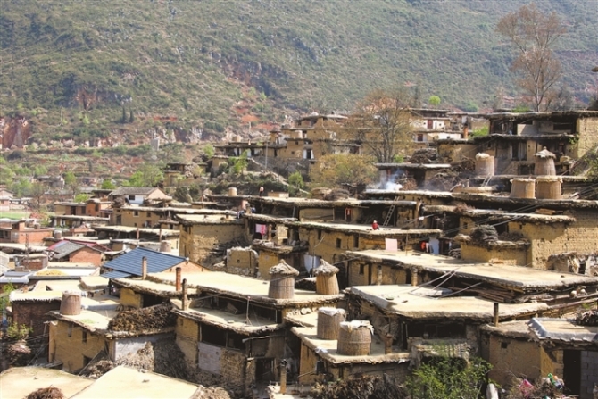 出縣城約25公里,遠遠看見如梯田一般的城子古村,整個村落是一種被稱作土掌房的建筑,全都以石為墻基,用土坯砌墻或用土筑墻,墻上架梁,梁上鋪木板、木條或竹子,上面再鋪一層土,經(jīng)灑水抿捶,形成平臺房頂,不漏雨水,可作曬場。有的大梁架在木柱上,擔上墊木,鋪茅草或稻草,草上覆蓋稀泥,再放細土捶實。這些建筑多為平房,為彝族先民的傳統(tǒng)民居,層層疊落,相互連通,堪稱民居建筑文化與建造技術發(fā)展史上的“活化石”。