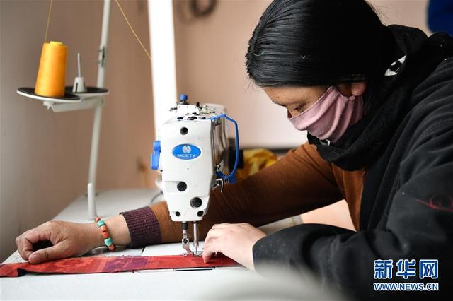 在青海省玉樹藏族自治州加吉娘社區(qū)民族服飾加工車間,當?shù)啬撩袼髂峡醋吭诳p制布飾(4月3日攝)。新華社記者 張龍 攝