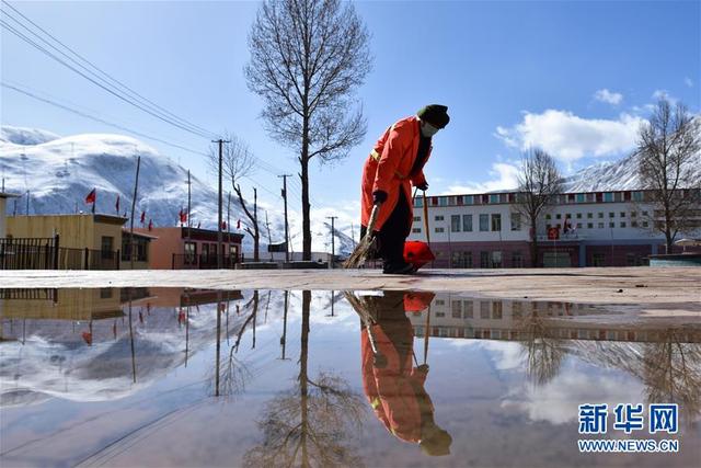 一名環(huán)衛(wèi)工人在青海省玉樹藏族自治州玉樹市扎西大同村的廣場清掃垃圾(4月6日攝)。新華社記者 吳剛 攝