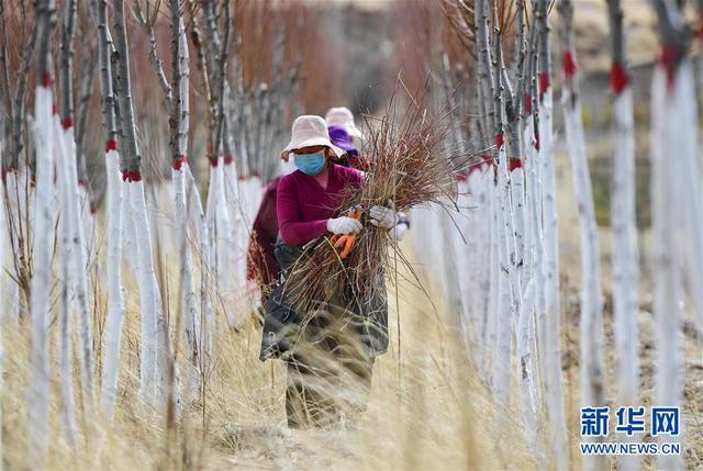 在青海省玉樹藏族自治州高原千畝林木良種繁育實驗基地,當?shù)厝罕娫谇謇硇藜暨^的樹枝(3月29日攝)。新華社記者 張龍 攝