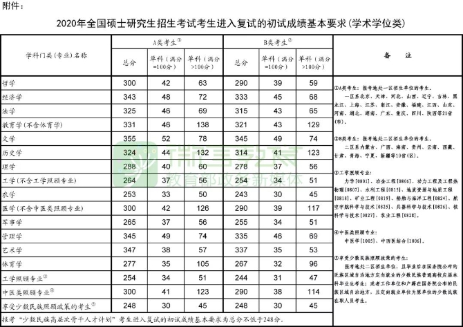 2020年全國(guó)碩士研究生招生考試考生進(jìn)入復(fù)試的初試成績(jī)基本要求 (學(xué)術(shù)學(xué)位類)