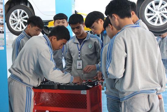 進(jìn)入硯山縣民族職業(yè)高中的實(shí)訓(xùn)基地,仿佛置身于4S店繁忙的維修車間。同學(xué)們有的把車頂起來,小心翼翼地?cái)Q開發(fā)動(dòng)機(jī)油底殼的螺絲,練習(xí)更換機(jī)油;有的神情緊張地盯著儀器,學(xué)習(xí)如何進(jìn)行四輪定位,還有的對(duì)著教具苦練汽車鈑金、車身修復(fù)……