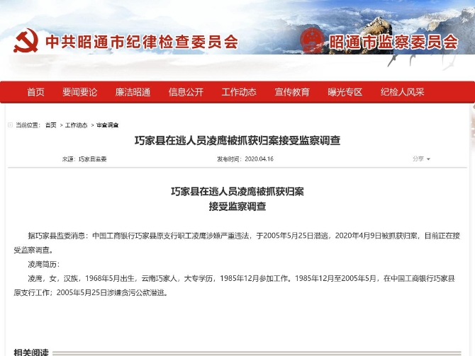 昆明信息港訊 機(jī)器人小明 據(jù)巧家縣監(jiān)委消息:中國(guó)工商銀行巧家縣原支行職工凌鷹涉嫌嚴(yán)重違法,于2005年5月25日潛逃,2020年4月9日被抓獲歸案,目前正在接受監(jiān)察調(diào)查。