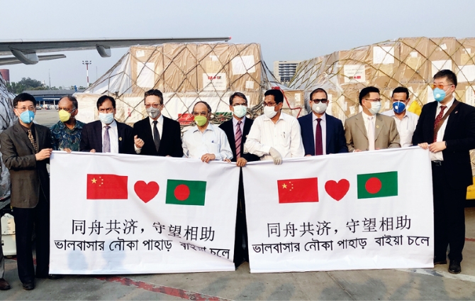 2020年3月26日,中國向孟加拉國提供緊急抗疫醫(yī)療物資援助。圖為中國駐孟加拉國大使李極明(左四)在孟加拉國首都達(dá)卡向孟方轉(zhuǎn)交援助物資。 新華社記者 劉春濤/攝