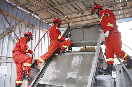 10分鐘后消防員到達現(xiàn)場,只見現(xiàn)場員工圍在一臺攪拌機前,一名工人正在與被困工友說話,力圖使他保持清醒。據(jù)一名員工介紹,這名工人不慎失足掉入攪拌槽,所幸被人發(fā)現(xiàn)后及時斷電,才未卷至機器深處。指揮員立即對現(xiàn)場進行勘查,初步勘查發(fā)現(xiàn),被困人員整個人都困在攪拌槽里面,雙腿已被混凝土覆蓋,且受傷嚴重。如不能及時施救,恐有生命危險。