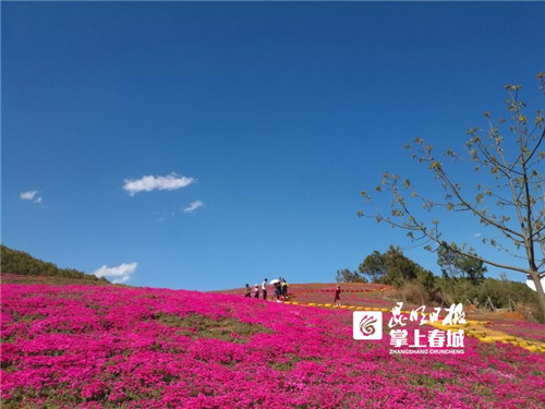 “今年的賞花亮點(diǎn),一是占地13000多平方米的芝櫻花瀑布《曲水流觴》景點(diǎn)效果初現(xiàn),二是3000多株紫藤盛開。目前入園賞花游客不斷增多,周末時(shí),一天的賞花游客達(dá)五千多人?!痹颇习谆⑸轿幕瘋鞑ビ邢薰究偨?jīng)理魏興林介紹,該公司打造的芝櫻花海面積達(dá)一千多畝,共種植紫色、白色、粉色、紅色等花色品種的芝櫻3000多萬株,是云南面積最大的芝櫻主題花海。由于當(dāng)?shù)貧夂颦h(huán)境優(yōu)越,因此芝櫻花不僅開花早、花色艷,而且花期長達(dá)2個(gè)月左右?!敖衲甑淖罴奄p花期從4月中旬持續(xù)到5月中旬。此外,這里種植芝櫻花一年花開兩季,除了春季,秋季還可以再次綻放?!蔽号d林說。