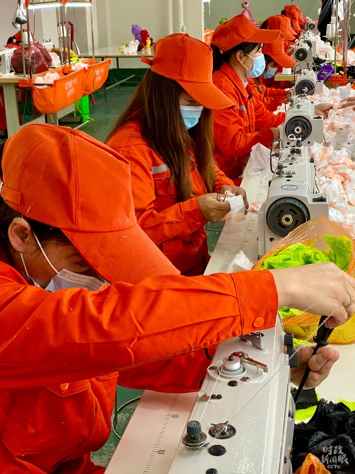 △這是開辦在社區(qū)內(nèi)的工藝制品廠,工人正在加工毛絨玩具。(總臺央視記者李輝拍攝)
