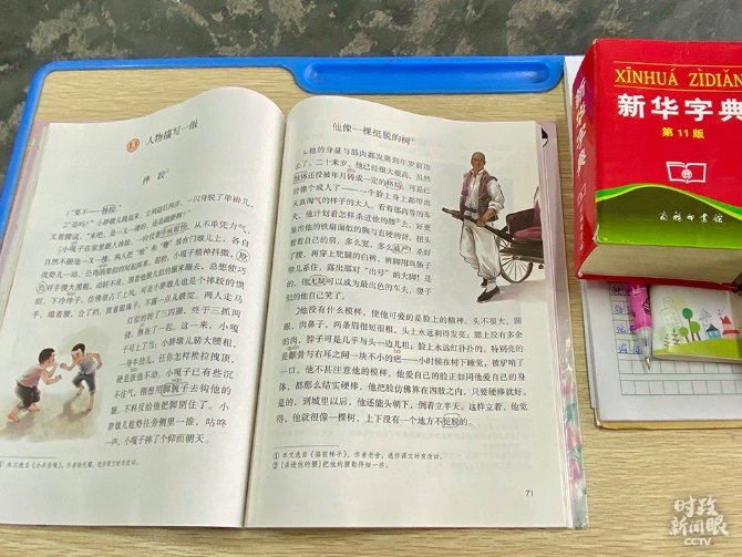 △今天的課文《摔跤》節(jié)選自《小兵張嘎》。(總臺央視記者段德文、彭漢明拍攝)