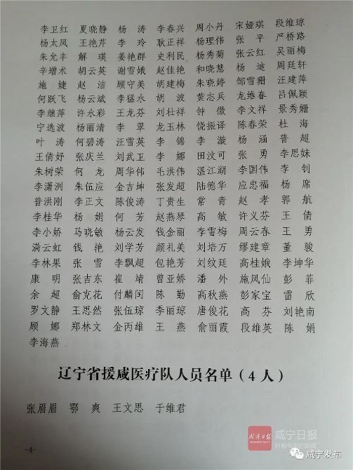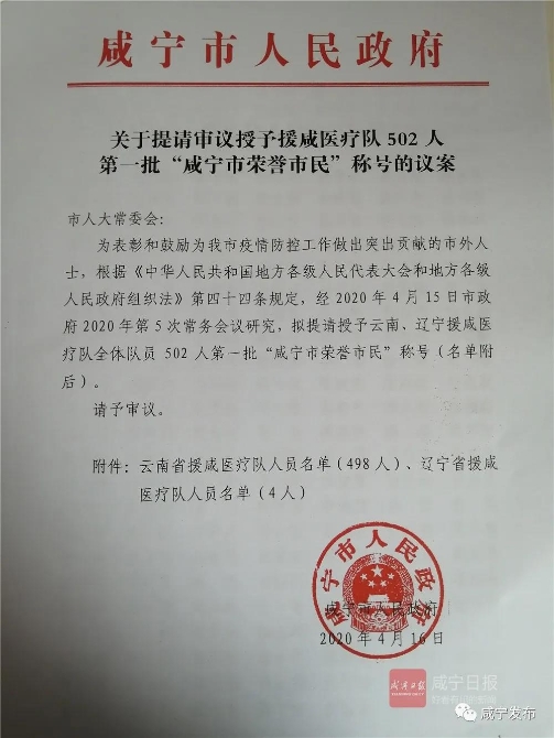4月21日,咸寧市召開市五屆人大常委會(huì)第二十三次會(huì)議,會(huì)上表決通過了市政府關(guān)于提請(qǐng)授予援咸醫(yī)療隊(duì)502人“咸寧市榮譽(yù)市民”稱號(hào)的議案。據(jù)悉,援咸醫(yī)療隊(duì)共計(jì)502人,其中云南醫(yī)療隊(duì)498人,遼寧醫(yī)療隊(duì)4人,均非咸寧籍人士。在咸寧市疫情防控最吃緊的時(shí)候,不畏艱險(xiǎn),逆行出征,千里馳援,奔赴咸寧“戰(zhàn)疫”一線。