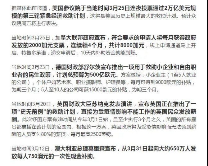 最近美國就因?yàn)橐咔閱?dòng)了緊急救援計(jì)劃,向中低收入人群每人發(fā)放 1200 美元。加拿大公布了 1070 億加元的救助計(jì)劃,向失業(yè)人員每人每月發(fā)放 2000 加元,相當(dāng)于 1 萬多元人民幣。而英國直接給受疫情影響無法工作的人,補(bǔ)貼他們工資的 80%。