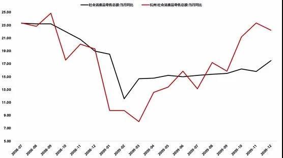 在2008年金融危機(jī)發(fā)放消費(fèi)券時(shí),當(dāng)時(shí)的社零增速從23.3%急速回落到11.6%,杭州市開始大批發(fā)放消費(fèi)券后,第二個(gè)月就出現(xiàn)明顯反彈,并且增速超過了全國水平。