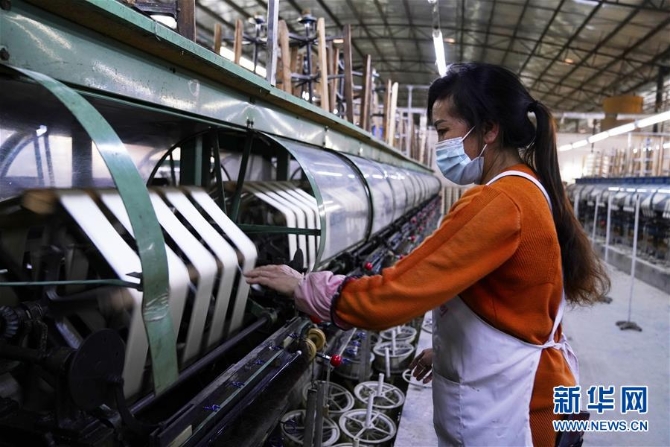 在廣西隆林嘉利繭絲綢有限公司生產(chǎn)車間,工人在操作生產(chǎn)設(shè)備(4月14日攝)。新華社記者楊馳攝