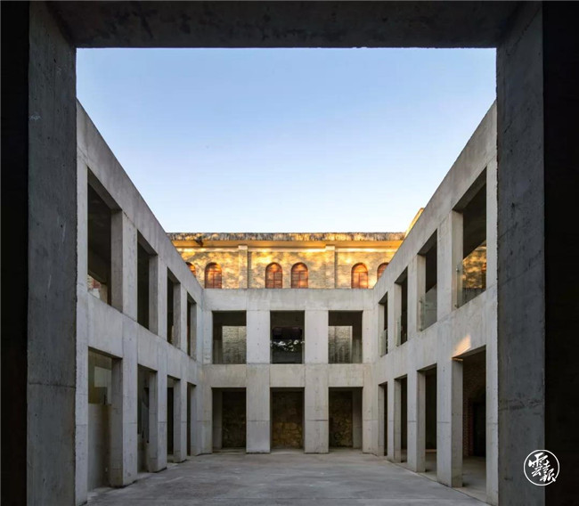 設(shè)計(jì)師還用一組混凝土回廊連起了老電影院和兩棟新建筑,在整片地上圍合出三個(gè)庭院。