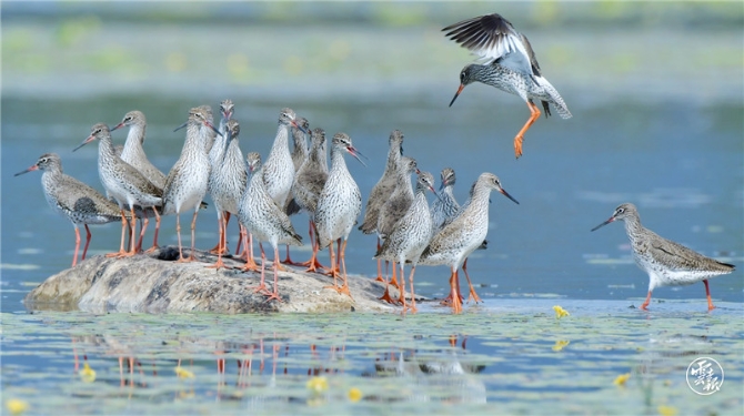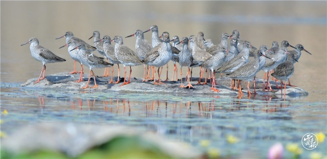 4月20日下午,43只紅腳鷸現(xiàn)身保山青華海國(guó)家濕地公園。它們時(shí)而閉眼休息、時(shí)而梳理羽毛、時(shí)而覓食、時(shí)而飛翔。在碧藍(lán)的水波間,紅腳鷸橙紅色的長(zhǎng)腳桿非常醒目,遠(yuǎn)遠(yuǎn)望去就像是踩著紅色的高跟鞋翩翩起舞,優(yōu)雅而靈動(dòng)。
