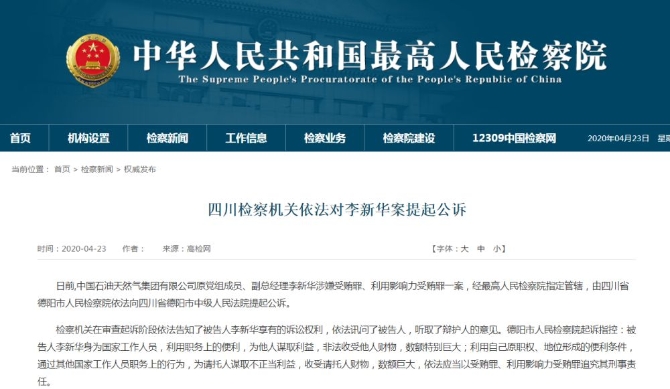 日前,中國石油天然氣集團有限公司原黨組成員、副總經(jīng)理李新華涉嫌受賄罪、利用影響力受賄罪一案,經(jīng)最高人民檢察院指定管轄,由四川省德陽市人民檢察院依法向四川省德陽市中級人民法院提起公訴。