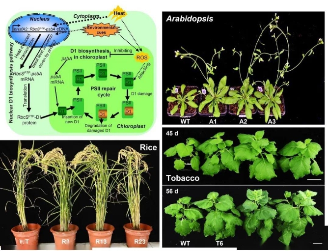按照以往,科學(xué)家們大多從葉綠體內(nèi)尋求解決方案,但郭房慶課題組突破思維定勢,利用先進(jìn)的遺傳工程手段,克隆并構(gòu)建了一個(gè)全新的、由高溫響應(yīng)啟動(dòng)子驅(qū)動(dòng)的“融合基因”,并整合擬南芥、煙草和水稻的基因組。經(jīng)過遺傳轉(zhuǎn)化,在擬南芥、煙草和水稻三種植物中,成功創(chuàng)建了一條全新的、細(xì)胞核融合基因表達(dá)的D1蛋白合成途徑。