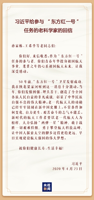 在第五個“中國航天日”和“東方紅一號”衛(wèi)星成功發(fā)射50周年到來之際,中共中央總書記、國家主席、中央軍委主席習近平4月23日給參與“東方紅一號”任務的老科學家回信,向他們致以誠摯的問候,并就弘揚“兩彈一星”精神、加快航天強國建設向廣大航天工作者提出殷切期望。