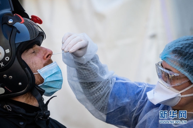 4月1日,在法國(guó)巴黎17區(qū),工作人員為一名接受新冠病毒檢測(cè)的醫(yī)護(hù)人員取樣。新華社發(fā)(奧雷利安·莫里薩爾攝)