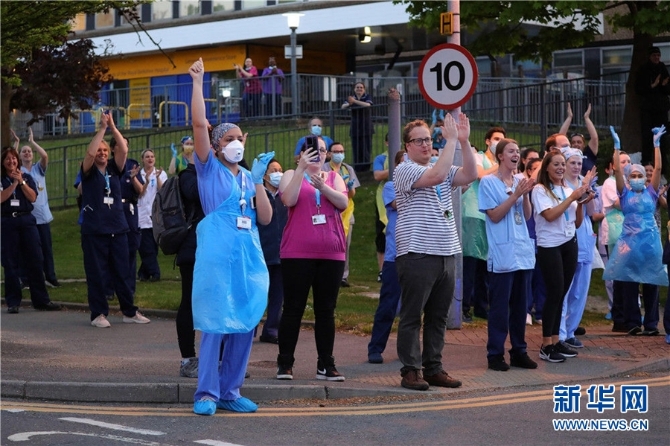 4月23日,在英國(guó)雷丁,皇家伯克郡醫(yī)院的醫(yī)護(hù)人員在醫(yī)院外鼓掌。新冠疫情暴發(fā)以來(lái),每周四晚八時(shí),英國(guó)人在陽(yáng)臺(tái)、門前或窗前鼓掌,向醫(yī)護(hù)人員致敬。部分醫(yī)院的醫(yī)護(hù)人員也忙里偷閑走出醫(yī)院,感謝人們的支持,也為自己鼓掌加油。新華社發(fā)(蒂姆·愛爾蘭攝)