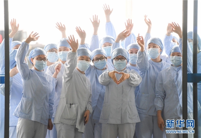 3月23日,武漢市第一醫(yī)院一些醫(yī)護(hù)人員在武漢天河機(jī)場(chǎng)為廣東第14批援鄂醫(yī)療隊(duì)送行。廣東第14批援鄂醫(yī)療隊(duì)在武漢期間,整建制接管武漢市第一醫(yī)院4個(gè)重癥病區(qū),與醫(yī)院的本地醫(yī)護(hù)人員結(jié)下深厚的友誼。新華社記者 陳曄華 攝