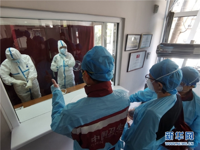 4月11日,在塞爾維亞首都貝爾格萊德,中國(guó)赴塞爾維亞抗疫醫(yī)療專家組在貝爾格萊德一所門診走訪,為醫(yī)護(hù)人員的防護(hù)意識(shí)點(diǎn)贊。新華社發(fā)(中國(guó)赴塞爾維亞抗疫醫(yī)療專家組供圖)