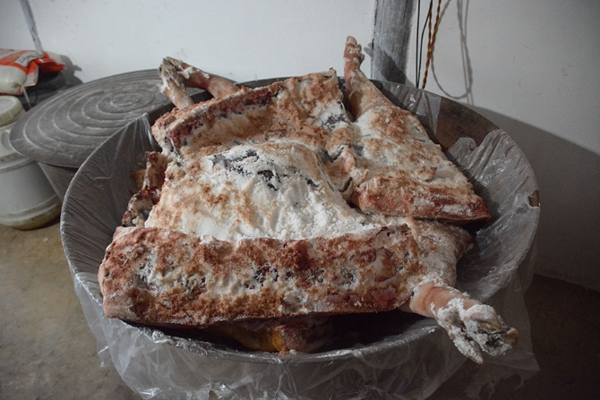 鮮腿撒鹽腌制(2019年12月26日攝)